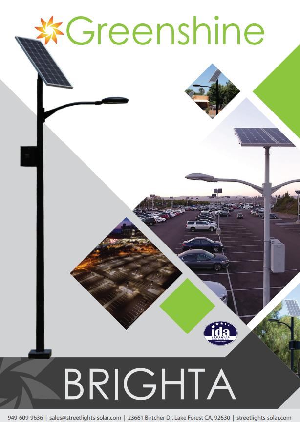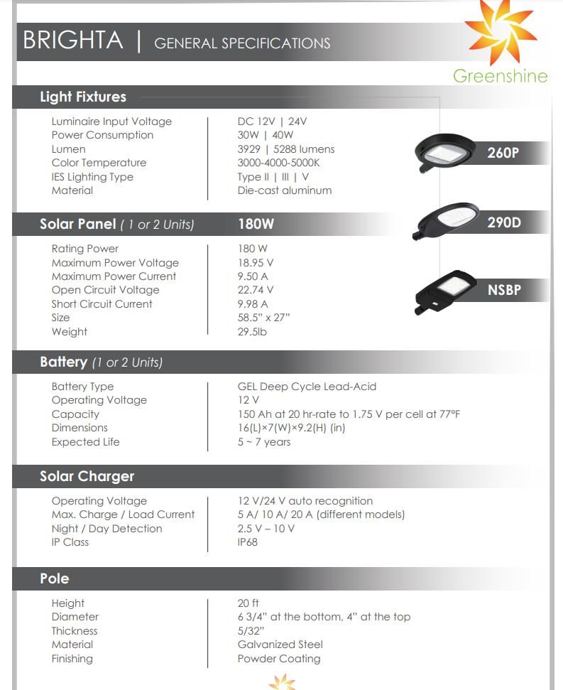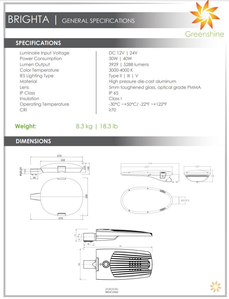 We’ve put together a simple guide to help you navigate the spec sheets of solar lighting products. Below are the key specifications to look out for: 1. Luminous Flux (Lumens)This measures the brightness of the light, which is crucial for determining light intensity and how much area the light will cover. Higher lumens typically mean brighter light, but it’s important to consider the specific needs of your project. 2. Battery Life & CapacityThis is especially important for off-grid solar lighting systems. It tells you how long the light will stay on through the night and how well the system can store energy. Look for high-capacity batteries for reliable, long-lasting performance. 3. Solar Panel EfficiencyEfficiency determines how quickly the panel will charge in the sunlight. Higher efficiency means quicker charging and better performance on cloudy days. 4. Durability & IP RatingThe durability of your solar lighting system is critical, especially if it will be exposed to the elements. The IP rating indicates how resistant the light is to dust and water. Make sure to select products with a high IP rating (IP65 or higher) to ensure they can withstand harsh weather conditions. With these key factors in mind, you can confidently choose the best solar lighting solution for your needs. Greenshine’s Solar Lighting SolutionsAt Greenshine, we offer a range of solar lighting products designed for both residential and commercial applications. Here are a few of our top solutions: Brighta Solar-Powered Street Light PolesOur Brighta solar-powered street light poles feature a 30-40 watt LED fixture with one solar panel. These systems are perfect for illuminating roadways, parking lots, pathways, and other outdoor areas, offering a sustainable and cost-effective lighting solution. With different wattage options, you can select the right system based on the size of the area you need to light. Brighta systems are designed for easy installation, minimal maintenance, and reliable performance in various environmental conditions.