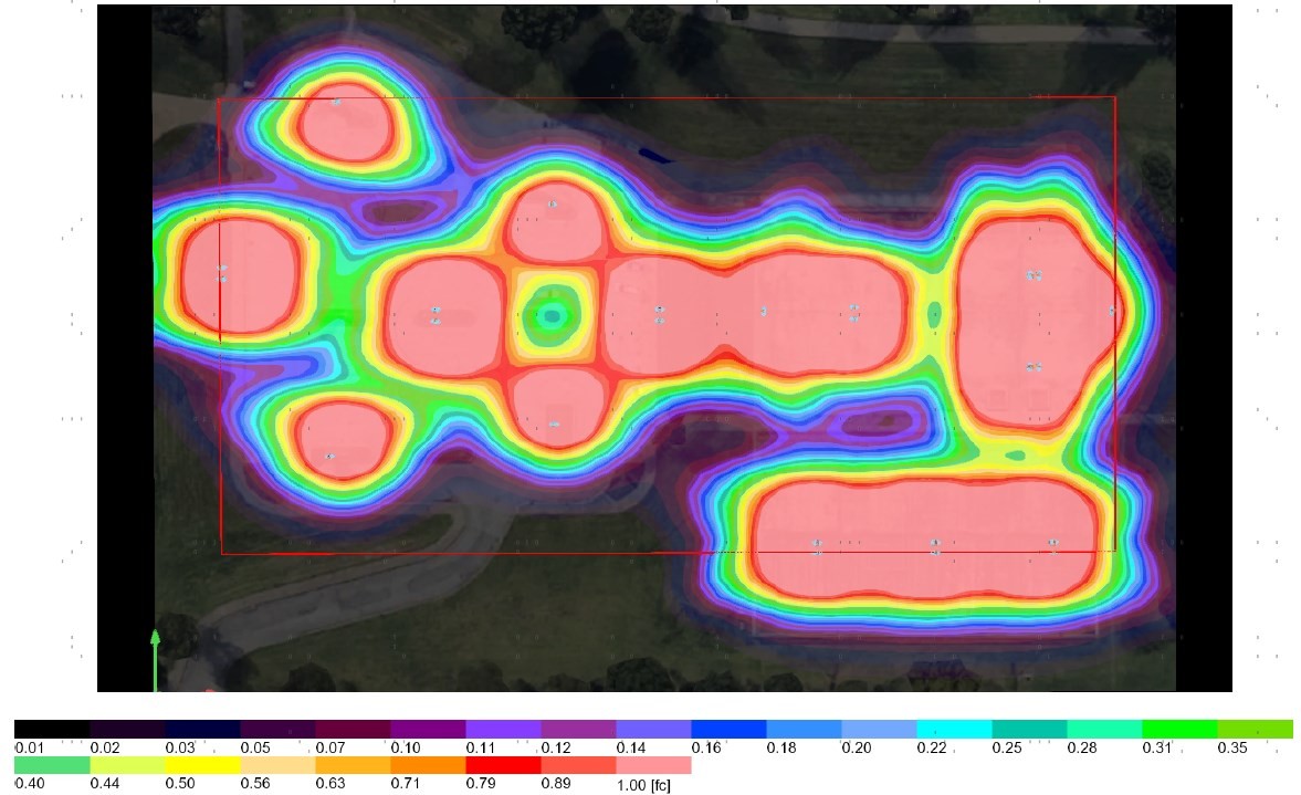 Lighting Simulation Demonstrates Greenshine’s Superior Coverage and Intensity for Pickleball CourtsPosted by Stephen Shickadance in Inspiring Projects. Applications of Solar Lighting.As pickleball continues to grow in popularity, the need for well-lit courts becomes essential to ensure players can enjoy their game at any time of the day or night. At Greenshine New Energy, we recently conducted a lighting simulation for pickleball courts at McClure Park in Oklahoma, showcasing the performance of our advanced lighting systems. The simulation results highlight the intensity and coverage our lights can provide, ensuring optimal visibility and an enhanced playing experience. Lighting Simulation -McClure Park Project OverviewFor this project, we simulated the installation of three dual 60W fixtures specifically for the pickleball courts. Although lighting was also provided to other areas like basketball courts and parking lots, the green area below is the actual location of the Pickleball courts. These lights are mounted at a height of 20 feet and designed with Type 3 optics, providing a color temperature of 4000K to balance brightness and clarity while minimizing glare.